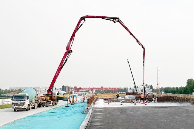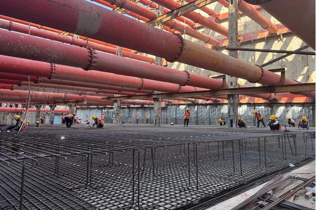 質(zhì)量管控方面,項(xiàng)目部實(shí)行全過程精細(xì)化管理。鋼筋工程嚴(yán)格執(zhí)行圖紙要求,對(duì)型號(hào)、間距、搭接等關(guān)鍵參數(shù)逐一驗(yàn)收;混凝土澆筑采用串筒工藝保障澆筑質(zhì)量,技術(shù)人員全程旁站監(jiān)督,定時(shí)檢測(cè)坍落度指標(biāo)。振搗作業(yè)遵循標(biāo)準(zhǔn)化流程,對(duì)關(guān)鍵部位加強(qiáng)振搗力度。混凝土初凝前實(shí)施二次抹壓工藝,有效提升結(jié)構(gòu)自防水能力。經(jīng)過70個(gè)晝夜的連續(xù)施工,項(xiàng)目部高質(zhì)量完成全部23節(jié)底板的封底任務(wù)。