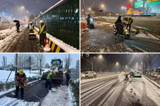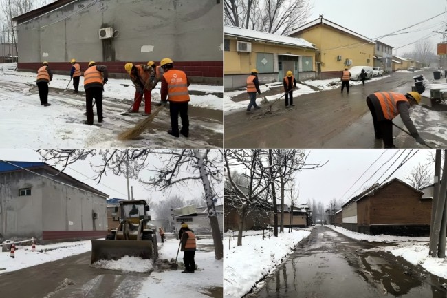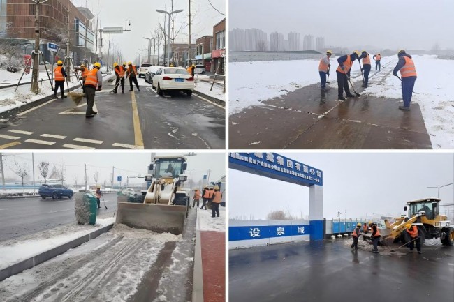 面對雪情,城建一公司起步區(qū)國博城項目部緊急組織職工應急值班,黨員干部帶頭駐守一線,密切關注雪情變化,巡查安全設施與道路狀況,預防夜間交通安全隱患。同時,項目部集結掃雪突擊隊,派出裝載機,配備鐵鍬、掃帚等工具,清掃項目周邊的主次干道、人行步道等區(qū)域的積雪積冰,為周邊居民、過往車輛提供了安全整潔的出行環(huán)境。