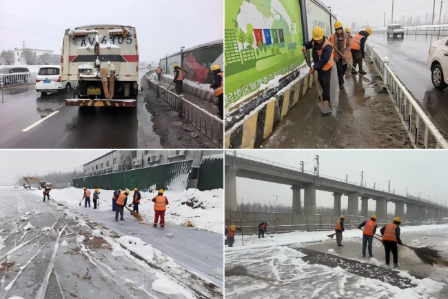 城建六公司黃崗路穿黃隧道項目部及人行天橋項目部針對309國道輔路、幸福寺路等處的積雪結冰情況,迅速部署,立即組織工人開展掃雪除冰作業(yè)。黨員干部和青年職工帶頭,分工協(xié)作,高效清除通行隱患,保障路段通暢,以快速響應和務實行動守護群眾平安,展現(xiàn)了國企為民服務的責任與使命。